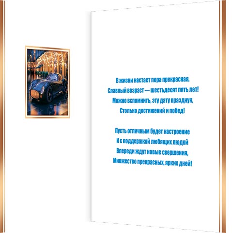 В жизни настает пора прекрасная, Славный возраст — шестьдесят пять лет! Можно вспомнить, эту дату празднуя, Столько достижений и побед! Пусть отличным будет настроение И с поддержкой любящих людей Впереди ждут новые свершения, Множество прекрасных, ярких дней!
