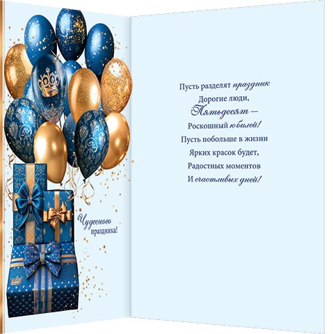 Пусть разделят праздник Дорогие люди, Пятьдесят — Роскошный юбилей! Пусть побольше в жизни Ярких красок будет, Радостных моментов И счастливых дней!