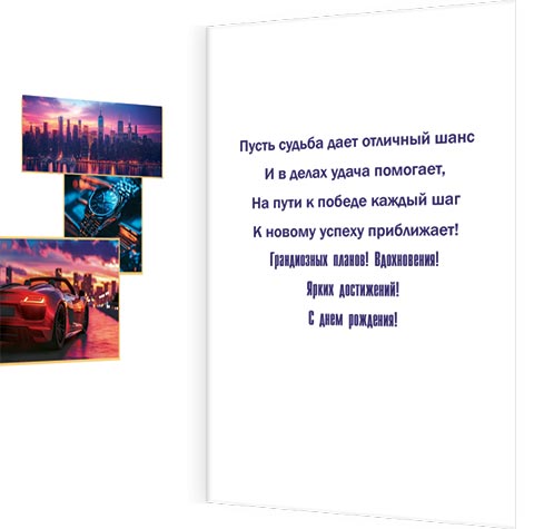 Пусть судьба дает отличный шанс И в делах удача помогает, На пути к победе каждый шаг К новому успеху приближает! Грандиозных планов! Вдохновения! Ярких достижений! С днем рождения!