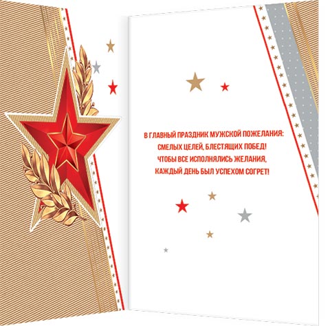 В главный праздник мужской пожелания: Смелых целей, блестящих побед! Чтобы все исполнялись желания, Каждый день был успехом согрет!