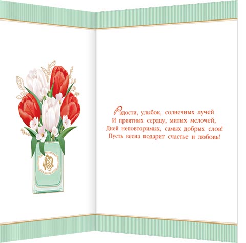 Радости, улыбок, солнечных лучей И приятных сердцу, милых мелочей, Дней неповторимых, самых добрых слов! Пусть весна подарит счастье и любовь!