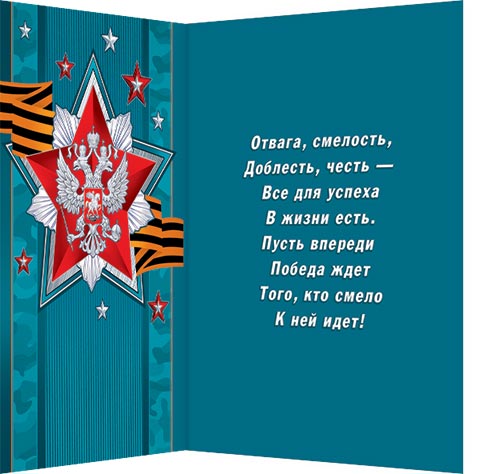 Отвага, смелость, Доблесть, честь — Все для успеха В жизни есть. Пусть впереди Победа ждет Того, кто смело К ней идет!