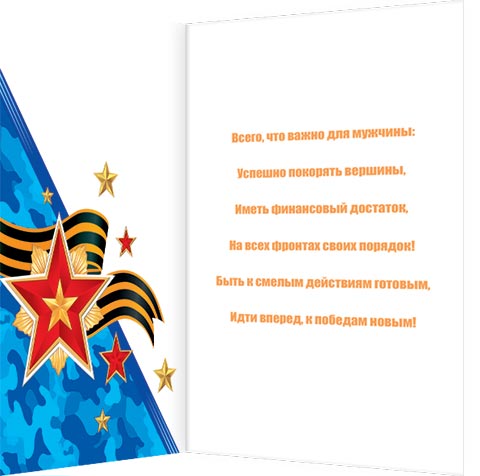 Всего, что важно для мужчины: Успешно покорять вершины, Иметь финансовый достаток, На всех фронтах своих порядок! Быть к смелым действиям готовым, Идти вперед, к победам новым!