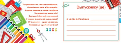 Ты прощаешься с классом четвёртым, Пятый класс тебя ждёт впереди. К новым знаниям, к новым пятёркам Ты уверенным шагом иди! Сколько будет задач, сочинений И стихов в школьной жизни твоей! Ну а главное — ярких мгновений, Интересных и радостных дней!