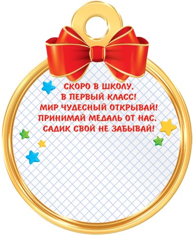 Скоро в школу, в первый класс! Мир чудесный открывай! Принимай медаль от нас, Садик свой не забывай!