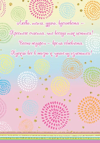Любви, тепла, удачи, вдохновенья — Простого счастья, что всегда так ценится! Весна недаром — время обновленья. Пускай все в жизни к лучшему изменится!